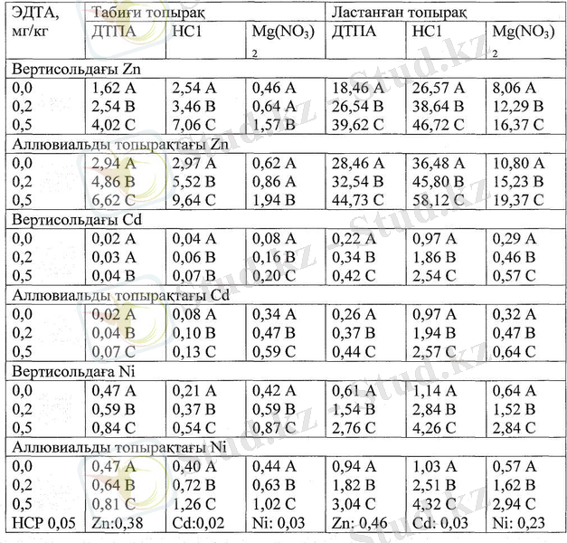 Аллювиальды топыраққа қарағанда вертисольда металдардың жалпы мөлшері жоғарырақ (Кесте 2) . Керісінше, металдың қозғалмалы формасы HC1, ДТПА және Mg(NO 3 ) 2 вертисольдарда төмен. Бұл факт металдардың экстракция деңгейі олардың жалпы мөлшеріне тәуелсіз екенін көрсетеді.