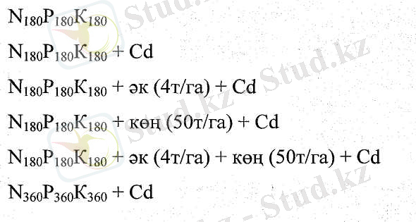 Минералды (нитрофоска), органикалық, әкті тыңайтқыштар бірқалыпты топырақ бетіне себілді. Кадмий CdSO 4 (10, 3r/M 3 ) күйінде енгізді.