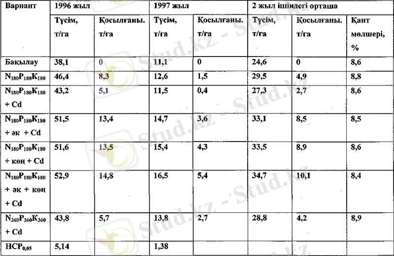 Орташа есеппен екі жылда қызылшаның түсімі 24, 6т/га-ды құрады (Кесте2) . Кадмиймен ластанған аудандарда оның мөлшері N 180 P 180 K 180 енгізген таза топырақпен салыстырғанда 2, 2т/га азайды. Бірақта әк пен көңді қосымша пайдалануы токсикалық элементтің жағымсыз әсерін азайтты. Кадмиймен ластанған топыраққа әк пен көңді бірге енгізгенде түсімнің көп бөлігі алынды.