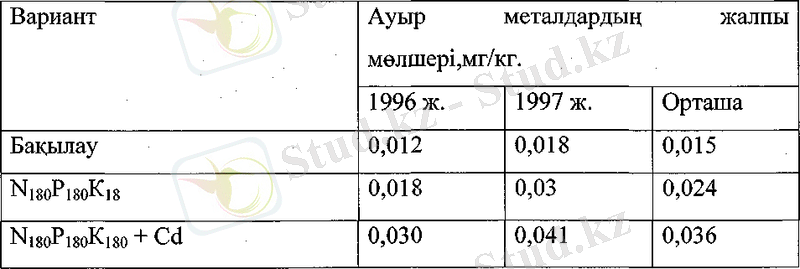 N 180 P 180 K 180 + Cd салыстырғанда, ол 1, 7 есе азайды. Біздің ойымызша, топырақта кадмийдің мөлшері бикорбанаттардың пайда болуына болады. Содан басқа осы элемнттің топырақтағы қосылыстары органикалық заттармен комплексті қосылыстар түзуі мүмкін.