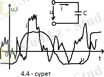 Осы жоғарыдағы токтың мәнін кернеудің (4. 11) мәнімен салыстырсақ, индуктивтік элементте периодты синусоидалдық емес токтың жоғарғы гармоникалық құраушыларының мәні гармоникалық құраушының реттік номері артқан сайын басым болады. Сол себептен, қисықтың кернеуінен қарағанда, осы қисық токтың мәні синусоидалық токтың мәнінен айырмашылығы аз болады (4. 3 - суретте) .