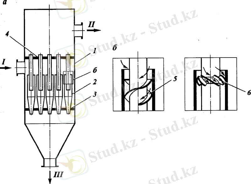 Циклонның құрылымы мен жұмыс істеу принципі 2. 1 - суретте көрсетілген газды санитариялық және өнеркәсіптік тазалау бойынша Ғылыми-зерттеу институтының (НИИОгаз, ҒЗИТгаз) аппаратының құрылымы мысалында қарастырамыз. Тозаңданған газ 15-25 м/с жылдамдықпен көлденеңдіктен салыстырмалы 15 0 бұрышпен орналасқан тенгенциалды патрубок бойымен циклонның цилиндрлік конустық корпусына 3 келіп түседі және корпус пен орталық шығу түтігі 2 арасындағы сақиналық саңылауда айналады. Бұл кезде тозаң бөлшектеріне немесе сұйықтың тамшыларына центрге тартқыш күш әсер етеді және олар корпустың қабырғасына қарай қозғалады. Тозаң қабырғаға жетіп, оның бойымен бункерге 4 сырғиды (сұйықтық қабырға бойымен ағады), ал газ бірнеше айналым жасап, жоғары қарай бұылып орталық түтік бойымен кетеді. Циклонның ішінде екі айналу ағыны пайда болады - периферияда төмен түсетін және орталық бөлікте жоғары көтерілетін. Тазаланған газдың айналмалы қозғалысын түзу сызықты қозғалысқа түрлендіу үшін циклонның жоғары жағына «улитка» 1 формасындағы тазаланған газ камерасына орнатылған.