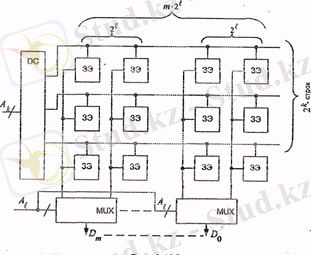 Керекті сөзді таңдауға арналған адрестік нышанның k+l разряды болады. k бір бөлігі 2 k жолдан қажетті жолды таңдауға беріледі, ал екінші l бөлігіберілген жолдағы керекті сөзді таңдауға мүмкіндік береді. Жолдың ұзындығы т· 2' тең, мұнда т - сақталатын сөздердің разрядтылығы. Мультиплексорлардың т шығыстарында әр разряды жолдың 2' ұзындығы бойынан таңдалатын шығыс сөзі қалыптасады.