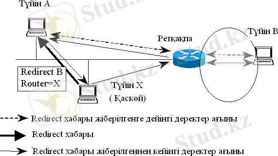 ICMP (Internet Control Message Protocol) хаттамасының негізгі міндеттерінің бірі түйіндерге ағымдағы бағдарлауыштың күй-жайы туралы хабардар етіп тұру болып табылады. Бұл хабардың аты redirect (0 кодасы - қабылдаушы желісіне қайта бағыттау) . Желі сегментіндегі кез келген түйіннен шабуыл жасалуға таңдап алынған түйінге жалған redirect -хабар жіберуге мүмкіндік бар. Қаскөй жалған ICMP Redirect хабарында өзінің немесе басқа кез келген IP мекен-жайды бағдарғылауыш ретінде көрсете алады. Ал RFC-1122 құжатының талабы бойынша, кез келген түйін келіп түскен redirect-хабарлардың бәрін міндетті түрде өңдеуге тиісті. Осының нәтижесінде түйін redirect-хабарын қабылдап алған соң өзінің ағымдағы бағдарғылау кестесіне өзгеріс енгізеді. Сөйтіп, осы түйіннің барлық деректер ағыны енді жалған redirect-хабарды жіберген түйін арқылы өтетін болды(1- сурет) .