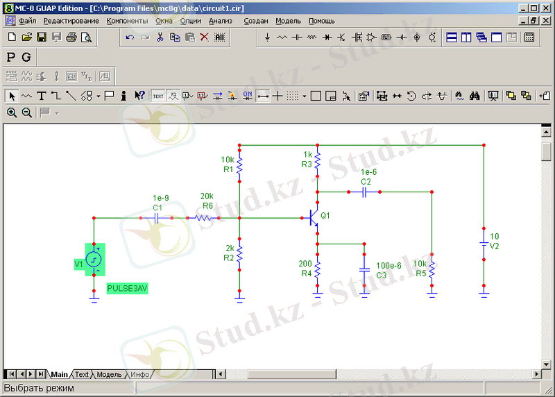 Қазіргі заманғы сұлба-техникалық моделдеу жүйесі арнаулы компьютерлік бағдарламаның көмегімен жүзеге асады. 2-суретте Micro-Cap V бағдарламаның көмегімен модельдеуге дайындалған күшейткіштің сұлбасы көрсетілген. Аспаптың математикалық моделі, оны эквивалентік сұлба мен сұлбаның элементтерін сипаттайтын математикалық өрнектермен алмастырады.