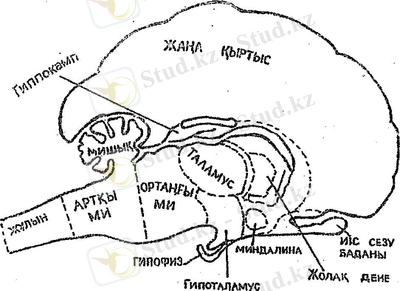 І; Эволюция процесінің барысында үлкен жарты шарлар ^ ~~ысьшың бұл "алғашқы" құрьшыс типі көптеген өзгерістерге райды. Төменгі сатылы сүтқоректілердің (біртесіктілер, _алылар, бунақценежегіштер) ми қыртысы сол "алғашқы" типке айды. Мысалы, кірпіде жарты шарлар ауданының 32 пайыздайы а жаңа қыртысқа тиесілі, шамамен осындай ауданды (30 пайыз) •дегі қыртыс, . ал қалған ауданды есқі және аралық қыртыстар І жатады. Итте жаңа қыртыс үлесіне ми сыңарлар бетінің 5/6-сі, ,, айыз), ал ертедегі қыртысқа 7 пайыздан аздау аудан келеді. Сүтқоректілердің жеке отрядтарының ішінде қыртыстың жеке Ібелгілерінің түрліше болып келетіні аныкталды. Бұл түсінікті де. бі, ми сыңарлар қыртысының езгеріп отыратын сыртқы орта Шларына бейімделетін мүше ретінде гшастикалық қасиетгерінің уы заңды нәрсе. Тіршілік ету жағдайларына байланысты ~>Істың қейбір бөлімдері күшті прогрессивті дамуға ұшырап, ал лары езгермей, сол қалпында қалады немесе регрессияға Іұшырайды. Мысалы, приматтар мен адамда ертедегі қыртыстың бір Ібөлімінің (йіс сезу төмпешігі) құрылысы өте қарапайым болады, ал ІІбаскд сүтқоректілердің көптеген өкілдерінде йіс сезу төмпешігі Іхақсы дамыған.