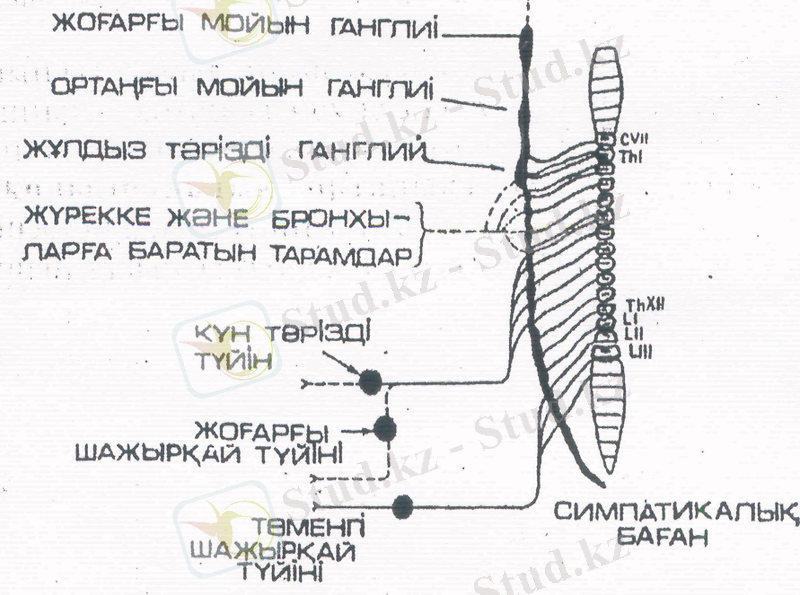 Симпатикалық нерв жүйесінің (1-сурет) орталықтары жұлынның жоғарғы кеуде (1) сегменті мен II-ІV-інші бел сегменттерінің сұр затының бүйір мүйіздерінде орналасады (т ораколюмбальдық орталықтар) . Бұлардан басталатын прегенглионарлық (ганглийге дейінгі) деп аталатын талшықтар жұлыннан алдыңғы түбірлердегі соматиқалық талшықтармен бірге шығады. Одан әрі шекаралық симпатиқалық бағанға бағытталады. Баған ганглийлеріндегі нейрондардан постганглионарлық (ганглийден кейінгі) талшықтар шығады. Бұлар организмнің барлық ішкі мүшелердің, сондай-ақ қан тамырларын жабдықтау арқылы қаңқа бұлшықеттерін, теріні, миды, т. б. инвервациялайды. Бірақ преганглионарлық симпатикалық талшыктар шекаралық бағана ганглийлерінен үзіліссіз өтіп, шеткі ганглийлерде (сәуле тәрізді шажырқай түйіндерінде) аяқталады. Бұлардағы нейрондардан шығатын постганглионарлық талшыкгар өз тарапынан құрсақ бөліміндегі мүшелерге бағытталады.