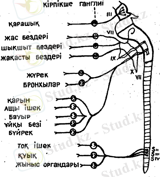Бөліп көрсетілгендер көз қозғағыш нерв (ІІІ) құрамында парасимпатикалық талшық басталатын ортаңғы ми; бас нервінің (VІІ), жұтқыншақ нервінің (IX) және кезеген нервінің (Х) құрамында болатын парасимпатикалық талшықтар басты латын сопақша ми жамбас нерв басталатын жұлынның сегізкөз бөлігі.