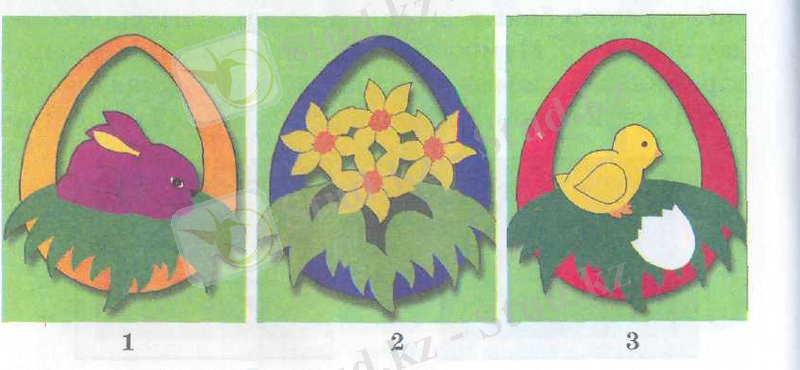 Мата қиықтарынан жасалған суреттер. Әр суреттің (1-3) бөлшектері суреттегі сияқты пішіледі. Жапсырмалау - алуан түрлі.