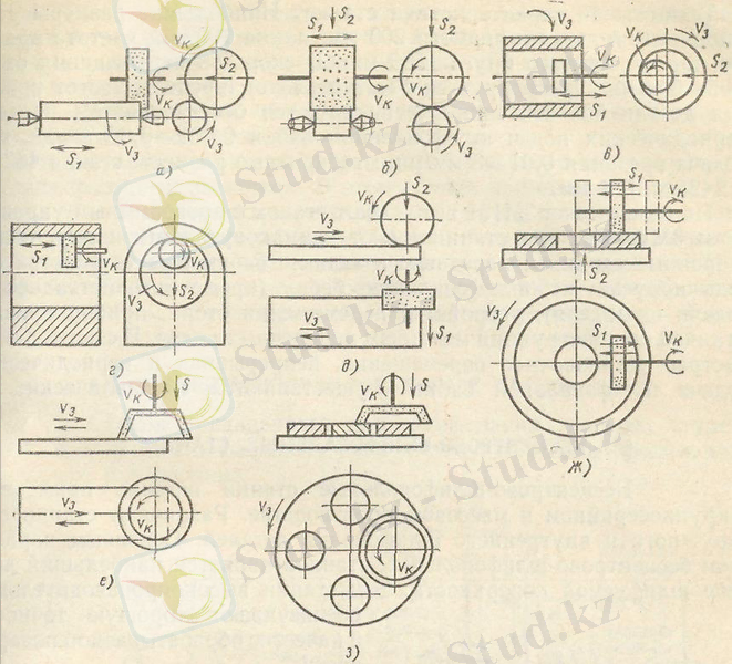 - Дөңгелек шет жағымен істеуші, тікбұрышты үстелі бар жазық ажарлайтын станоктар үшін (1. 2 ж сурет) беріс қозғалысы-үстелдің бойлық орын ауыстыруы және беріс тереңдігіне дөңгелектің периодтық вертикаль орын ауыстыруы s. Домалақ үстелімен ұқсама жазық ажарлайтын станоктарда (1. 2 з сурет) үстелдің айналмалы қозғалысы және беріс тереңдігіне дөңгелектің периодтық берісі s бар.