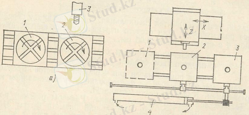 Қос бұрылмалы үстелдерімен 1 мен 2 станоктың тікбұрышты үстелі. Үстелді жүктеу және жүктен бостауды 1 дайындаманы үстелде 3 айналдырықпен 3 өңдеу кезінде орындайды. Кейде үстелдердің біреуі тетіктерді бірнеше жағынан тізбектей өңдеу үшін арналған периодтық бұрылыс механизміне ие, ал екіншісі цилиндрлік және күрделі қисықсызықтық беттерді өңдеу үшін үздіксіз бұрыла алады.