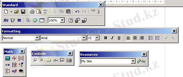 - ПанельдегіStandard, Formatting, Math, Controls, Recourcesбөлімдері . Бұл панельдерді жұмыс ортасының кез-келген бөлігіне орналастыруға болады.