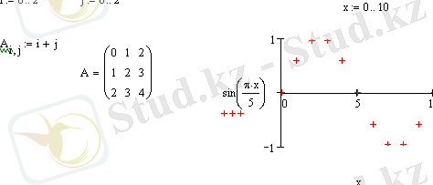- матрицаның бірінші калонкасы) көз жүгіртуіміз керек. Массивтің элементтері сан, тұрақтылар, айнымалы және басқа массивтер болуы мүмкін. Массивтер әдетте сандық және символдық түрде болады. Векторлар мен матрицалармен жұмыс істеуге арналған негізгі операциялар