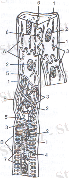3-сурет. Кардиомиоциттердің құрылысы. А - өткізуші, Б - аралық, В - жұмысшы.