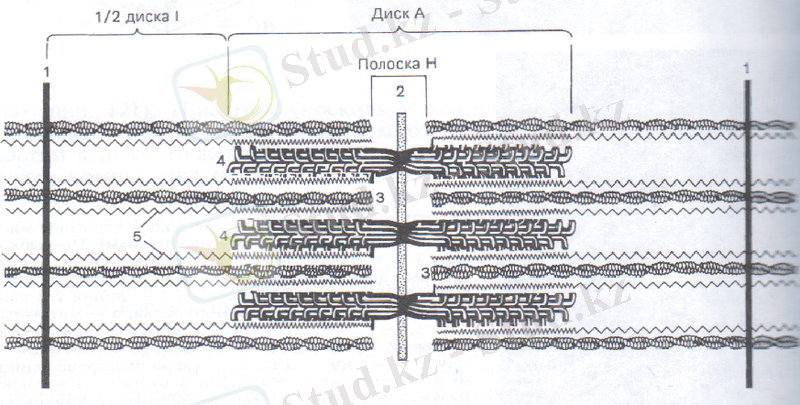 2-сурет. 1 - Z-жолағы, 2 - М-жолағы, 3 - актин филаменті, 4 - миозин филаменті, 5 - титиннің фибриллярлы молекуласы.