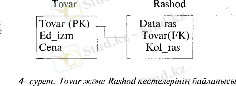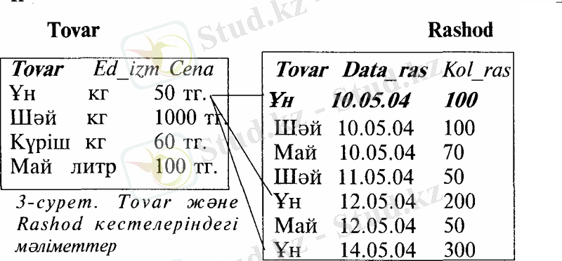 "Бірге-көп" байланысына (1:М) қоймадан тұтынушыларға жіберілген заттарды есепке алу тарифі бойынша Tovar және Rashod кестелерінің байланысын көрсетуге болады (3, 4-суретгер), мұңцағы Tovar- заттың аты, Edjzm - тауардың өлшем бірлігі, Сепа - тауардың бір бірлігінің сату бағасы, Dataras- тауардың жібірілген күні, Kolras - жіберілген заттың саны. Бұл мысалдағы 14. 05. 04 -не дейінгі мәліметтер бойынша күріш әлі сатылмаған, соңдықган Rashod кестесіңце күрішке сәйкес жазба жок, Rashod кестесінің кілті Tovar және Rashod жиектерінен тұрады.