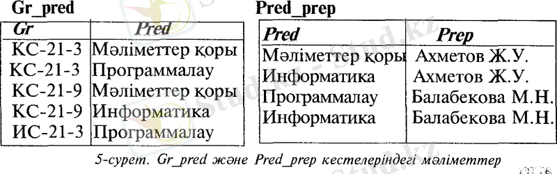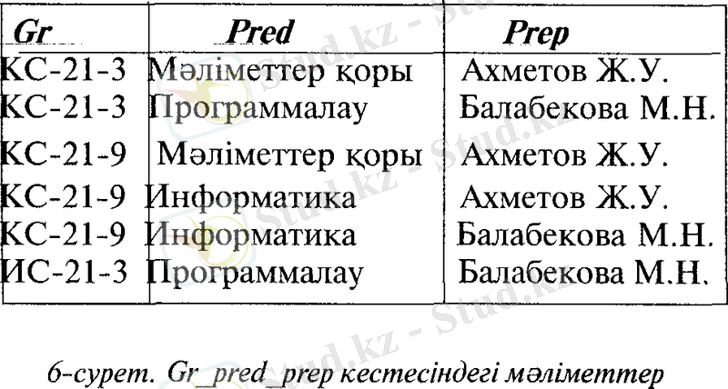Grpred кестесінің бірінші және үшінші жазбаларына Pred_prep кестесінің бірінші жазбасы, ал төртінші жазбасына- екінші және төртінші жазбалары сәйкес келеді. Бұл кестелерді Pred жиектері бойынша біріктіру арқылы әр топтағы пәндерді жүргізетін оқытушылар туралы мәліметгерден тұратьш Gr_pred_prep кестесін алуға болады (6-сурет) .