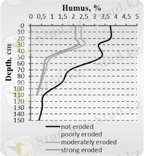 қалдықтарды сақтау және оларды көму зоналарында топырақтың ластануы ерекше жылдам жүруде. Суретте гумустың топырақтың белгілі бір тереңдігіндегі концентрациясы берілген. Гумус концентрациясы неғұрлым азайған сайын, оның эрозияға қанша см тереңдікте болса да, эрозия ұшырағыш болатындығын көрсетеді. Бұл чернозем топырағында алынған көрсеткіштер болып табылады. Гумус концентрациясы жоғары, өзі сапалы болуы үшін бактерияның рөлі көп.