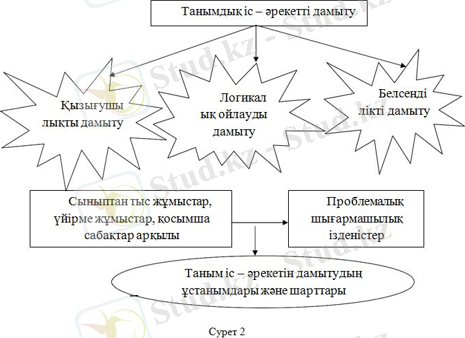 Авторлар танымдық өзбеттіліктің қалыптасу жолдарын әр түрлі, яғни өзбеттілік жұмысты ұйымдастыру, танымдық әрекеттің тәсілдерін қалыптастыру және тағы басқа арқылы қарастырады. Төменде суретте Химиядан оқушылардың танымдық іс әрекеттерін дамыту әдістері көрсетілген (Сурет 1) .