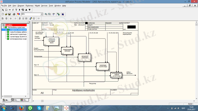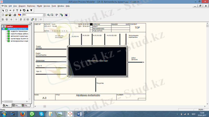 Контекстілі диаграмманы декомпозициялау жұмысы кезінде автокөлікті құрастыру процесі көрсетілген. Яғни, өндірістік техникалық жоспарын бекітуден бастап, дайын автокөлікті жасап шығрау жұмысына дейін жоспар құрады. Деректерді интеллектуалды талдау құралдарымен кәсіпорынның бизнес- процесстерін жетілдіру. Көптеген үлкен, кіші және орта кәсіпорындарда бизнес- процесстердегі кәсіпорын тапсырмаларын шешу үшін деректерді интеллектуады талдау технологиясын қолданады. Бизнес- процесстердің сапасы мен тиімділігі қазіргі уақытта Қазақстан Республикасында басқа мемлекеттермен салыстырғанда айырмашылықтар байқалады.
