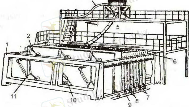 1 - сырты; 2 - кассета қысу үшін тіреулер; 3 - бетон білік пневмокөлік бетон қоспалар; 4 - бетон араласпасы үшін басқыш (циклон) пневмокөлік араласпасы; 5 - қалыптарға қоспа жүктеу үшін солқылдақ шланг; 6 - бөлгіш қабырғалардың роликті тіректері; 7- аспалы дірілдеткіш; 8 - кассетаны тігінен бөлетін қабырғалар; 9 - жылу бөліктеріне бу жеткізгіш; 10 - ашатын рычаг білігінің гидроцилиндрі; 11 - кассетаны жинақтау және босатушы рычагты жүйесі (тік қабырғалардың орын ауысуымен байланысты)