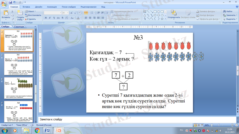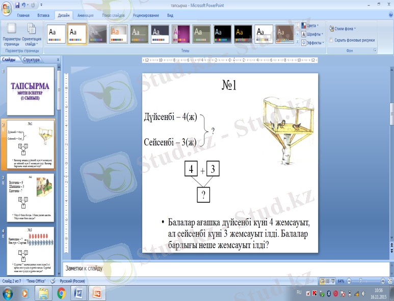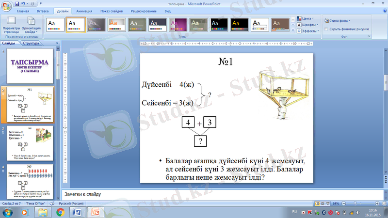 Мысалы: Балалар ағашқа дүйсенбі күні 4 жемсауыт, ал сейсенбі күні 3 жемсауыт ілді. Балалар барлығы неше жемсауыт ілді?