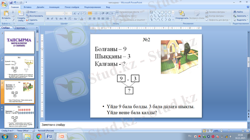 Мысалы: Үйде 9 бала болды. 3 бала далаға шықты. Үйде неше бала қалды?