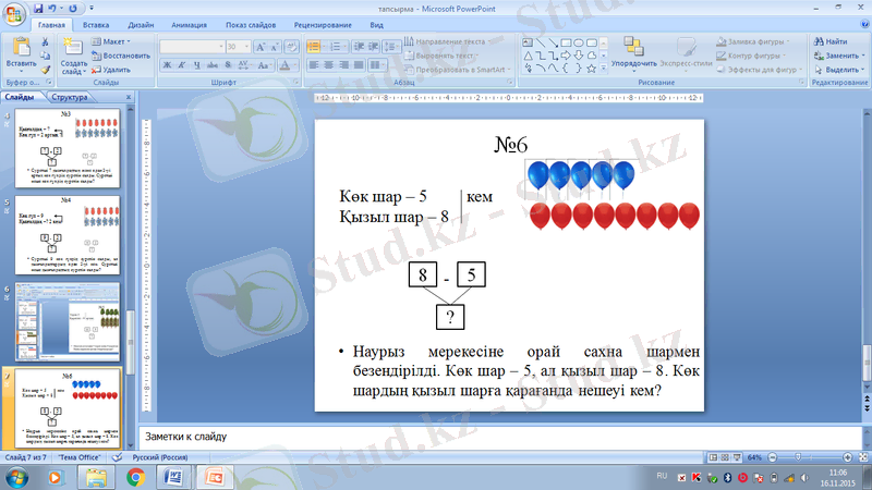 Мысалы: 6. Наурыз мерекесіне орай сахна шармен безендірілді. Көк шар - 5, ал қызыл шар - 8. Көк шардың қызыл шарға қарағанда нешеуі кем?