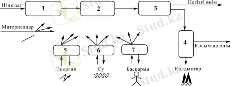 1-сурет. Химиялық өндірістің құрылымы жəне функционалды элементтері: 1 - шикізатты дайындау; 2 - шикізатты өңдеу; 3 - негізгі өнімді бөлу; 4 - қалдықтың утилизациясы жəне санитарлық тазалау; 5 - энергетикалық жүйе; 6 - қосымша материалдар мен суды дайындау; 7 - басқару жүйесі Суреттегі 1-3 бөлімдер - шикізатты өнімдерге дейін өңдейтін химиялық өндіріс. Шикізатты дайындау (1) бөлімінде оны алдын ала өңдеу үдерістері, яғни ұнтақтау, бөгде қосындылардан тазарту, компоненттерді араластыру жəне т. б. жүргізіледі. Шикізатты дайындау үдерістері шикізат түріне жəне оны өзгерту жағдайына байланысты болады. Дайындалған шикізат компоненттері өзара химиялық əрекеттесуге түседі де (2), нəтижесінде жаңа заттардың түзілуі жүреді. Көптеген жағдайда химиялық өзгерістердің нəтижесінде таза өнім алу мүмкін емес. Ол реакцияға түспеген бастапқы шикізаттың аздаған бөлігімен араласқан, сондықтан түзілген қоспадан негізгі өнімді бөліп, оны бөгде қосындылардан тазалайды (3) . Өндіріс қалдықтарының құрамында қоршаған ортаға қауіпті зиянды компоненттермен қатар тастауға келмейтін пайдалы заттарда болуы мүмкін. Сондықтан химиялық өндірістің маңызды элементтерінің бірі - санитарлық тазалау жəне өндіріс қалдықтарының утилизациясы (4) . Санитарлық тазалау немесе қалдықтарды залалсыздандыру - құрамындағы улы заттарды қоршаған ортаға қауіпсіз болатын зиянсыз затқа айналдыру. Химия өнеркəсібі шикізатты өнімге дейін өңдеу үшін өте көп мөлшерде (барлықэнергоресурстың ~15%) энергия жұмсайды. Сондықтан энергетикалық жүйе - химиялық өндірістің маңызды жəне күрделі элементі (5) . Энергия тікелей өнімді алу үшін жұмсалудан, негізінен өндірістің жұмыс істеу жағдайын қамтамасыз етуге пайдаланылады. Сонымен бірге химиялық өзгерістер энергия бөлу арқылы (экзотермиялық реакция) жүреді. Сондықтан энергияны шикізатты өңдеуге қолданғаннан кейін мүмкіндігінше қайтаруды ойластыру керек. Химиялық өндірісте энер-
