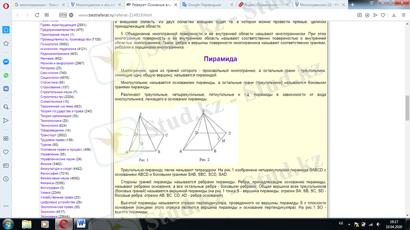 Пирамида. Көпжақтардың ерекше қызықты түрінің бірі - пирамида. Пирамида тақырыбын қозғағанда Мысыр пирамидаларын атамай кету мүмкін емес. Олар тек математиктерді ғана емес, сонымен қатар физиктерді, тарихшыларды, т. б. қызықтырып келеді. Пирамида деп бір жағы кез келген көпбұрыш, ал қалған жақтары төбелері ортақ үшбұрыштардан тұратын көпжақты атайды. Пирамидаларды дөңес және дөңес емес деп бөлеміз. Пирамиданың биіктігі дегеніміз - оның төбесінен табан жазықтығына түсірілген перпендикуляр немесе осы перпендикулярдың ұзындығы. Егер пирамида табаны дұрыс көпбұрыш болып, төбесінің проекциясы табанының центріне дәл түссе, онда ол дұрыс пирамида деп аталады. Дұрыс пирамиданың бүйір жағының пирамида төбесінен түсірілген биіктігі пирамиданың апофемасы деп аталады. Дұрыс пирамиданың: