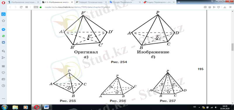 P' A ' B ' C ' D ' төртбұрышты пирамидасының бейнесін құру үшін (сурет. 254, а) онда P' A ' B ' C үшбұрышты пирамида бөліп аламыз және оны pabc еркін толық төртбұрыш түрінде бейнелейміз (сурет. 254, б) . Осы пирамиданың d төбесінің d - бейнесі нүктесін салу қалды. Осы мақсатта осы пирамиданың негізі A' C' және B ' D ' диагоналін өткіземіз. E' = A' C'B' D ' Құралы Болсын. Параллельді жобалау кезінде бір түзуде жатқан үш нүктенің қарапайым қатынасы сақталатындықтан, онда A' E': E' C' = AE : EC ac кесіндісінде e нүктесін, ал B 'E': E ' d ' = BE : ED be сәулесінде d нүктесін саламыз. D нүктесін a, P және C нүктелерімен түзулермен біріктіріп, P ' A ' B ' C ' D ' төрт бұрышты пирамидасының pabcd ізделетін суретін аламыз. Бейненің көрнекілігіне жету үшін пирамиданың көрінетін қабырғаларын тұтас бөліктермен, ал көрінбейтін қабырғаларын штрихпен бөлеміз. Кез келген n-бұрышты пирамидасының бейнесі құрылады.
