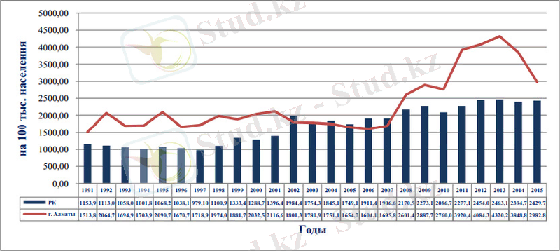 - Сурет. Қазақстан Республикасында және Алматы қаласында 1991-2015 жылдары алғаш рет анықталған ҚЖА диагнозы бар сырқаттанушылық динамикасы (100 мыңға. )