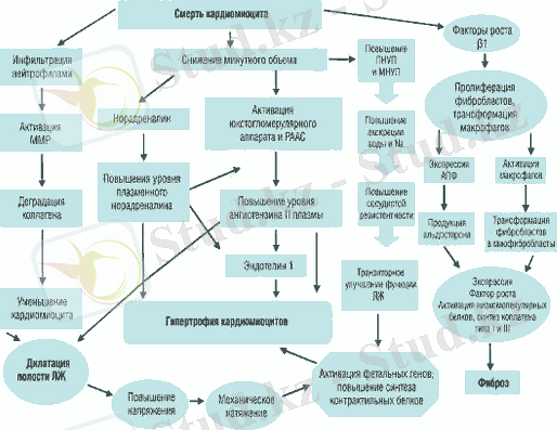 1. 3. Сурет. Сол жақ қарыншаның инфактан кейінгі қайта модельденуінің патогенезі (бейімделді St. John Sutton, 2000) . ПНУП-атриальды натрийуретикалық пептид; МНУП-ми натрийуретикалық пептид; ММР - матриксті металлопротеаздар.