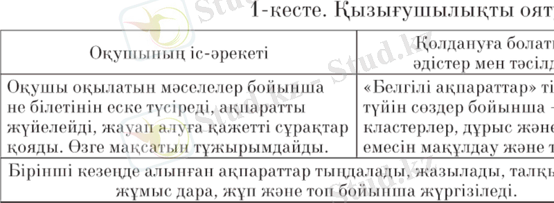 Қызығушылықты ояту. Үйрену процесі - бұрынғы білетін және жаңа білімді ұштастырудан тұрады. Білім алушыны жаңа ұғымдарды, түсініктерді, өзінің бұрынғы білімін жаңа ақпаратпен толықтырады, кеңейте түседі. Сондықтан да, сабақ қарастырылғалы тұрған мәселе жайлы білім алушы не біледі, не айта алатындығын анықтаудан басталады. Осы арқылы ойды қозғату, ояту, ми қыртысына тітіркенгіш арқылы әсер ету жүзеге асады. Осы кезеңге қызмет ететін «Топтау», «Түртіп алу», «Ойлану», «Жұпта талқылау», «Болжау, «Әлемді шарлау» т. б. деген аттары бар әдістер (стратегиялар) жинақталған. Қызығушылықты ояту кезеңінің екінші мақсаты - білім алушының белсенділігін арттыру.