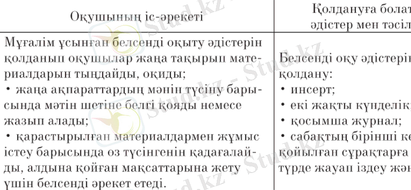 - оқыту үрдісінде оқушының белсенділігін қолдау;