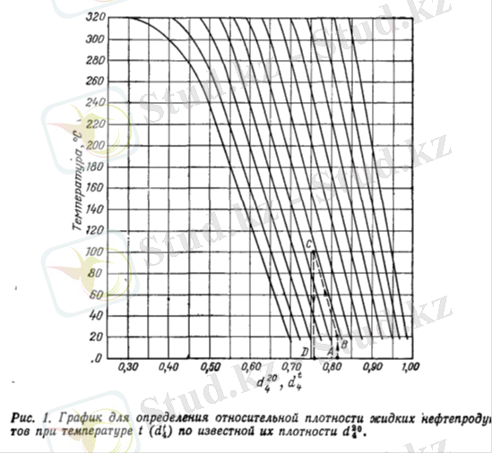 Сұйық мұнай өнімдерінің тығыздығын жоғары температурада анықтау үшін келесі графикті пайдаланады. (1-сурет)