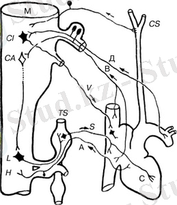 С-жүрек; М - ұзын ми; CI - жүрек қызметін тежейтін ядро; СА - жүрек қызметін ынталандыратын ядро; LH - жұлынның бүйірлік мүйізі; 75 - симпатикалық діңгек; V - кезбе нервтің эфференттік талшықтары; Д - нервдепрессор (афференттік талшықтар) ; S - симпатикалық талшықтар; а - жұлын афференттік талшықтар; CS - каротидті синус; В-оң жүрекшеден және қуыстан афференттік талшықтар. веналар