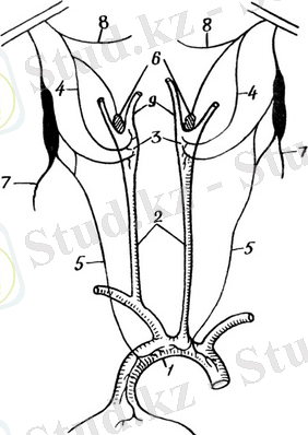 Сур. 2. Синокаротидті және аортальды рефлексогенді аймақтар: 1 - аорта; 2 - жалпы ұйқы артериялары; 3 - каротидті синус; 4 - синустық нерв (Геринг) ; 5 - аортальды нерв; 6 - каротидті тельце; 7 - кезбе нерв; 8 - тіл-жұтқыншақ нерв; 9-ішкі ұйқы артериясы
