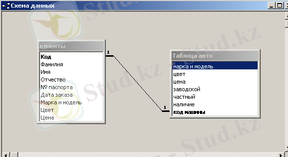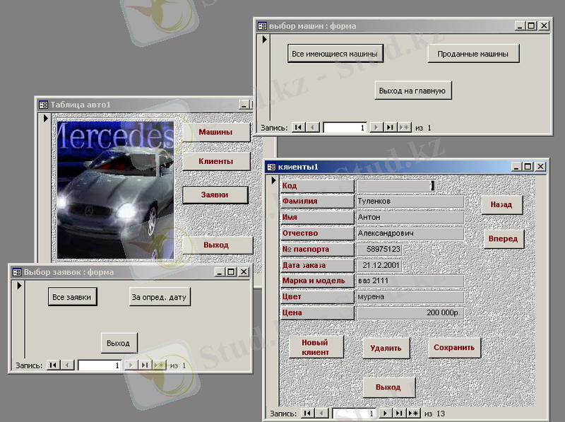 "Автомагазин" деректер қоры екі кестеден, алты сұраныстан, тоғыз нысаннан және үш есептерден тұрады. 1-кесте "авто" осы автомагазин арқылы өткен барлық автомобилдер туралы ақпаратты қамтиды. 2-кесте "клиент" барлық клиенттер туралы ақпаратты қамтиды.