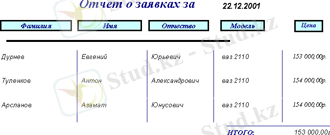- Деректер қоры келесі функцияларды орындауы керек:Өтінім бойынша деректерді енгізуКүн сайынғы (жұмыс) есепте бір күн ішінде атқарылған жұмыс туралы-осы күні сатылған автомобильдер туралы ақпарат шығару. Кез келген сұраныс бойынша бар автомобильдер туралы ақпаратты шығаруШығару