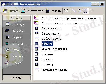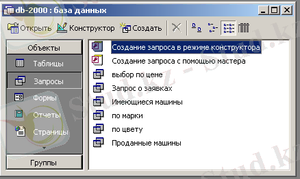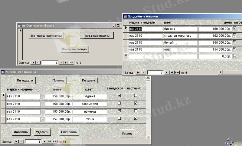 1-сұраным "баға бойынша таңдау" -бұл сұраныс клиенттің қолда бар сомасы шегінде сатылмаған машинаны табуға мүмкіндік береді. 2-сұрау "маркамен" - қалаған модель бойынша сатылмаған автомобильдің ішінен машинаны табуға мүмкіндік береді. 3-сұрау "түсі бойынша" - қалаған түсі бойынша сатылмаған автомобильдердің ішінен машинаны табуға мүмкіндік береді. 4-сұрау салу" қолда бар машиналар " - фирма арқылы тек сатылмаған, яғни қолда бар машиналардың барлық тізбесінің ішінен іріктейді. 5-сұрау "Сатылған Машиналар" салу-фирма арқылы сатылмаған машиналар тізбесінің ішінен іріктейді. 6 -сұрау "өтінімдер туралы" сұрау салу - осы сұрау салу белгілі бір күні қанағаттандырылған өтініштер туралы ақпаратты табуға мүмкіндік береді.