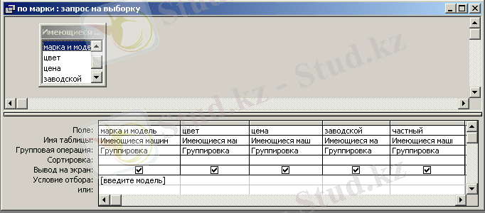 Бұл сұрау шарт бойынша іріктеуге сұрау салу болып табылады, өйткені оған жүгінген кезде тек қана «Наличие = Ложь». . шартын қанағаттандыратын жазбалар іріктеледі. . Ол "Авто"кестесі негізінде құрылады.