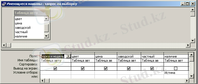 Бұл сұрау салу шарты бар іріктеуге сұрау салу болып табылады, өйткені оған өтініш білдірген кезде «Наличие = Истина» шартын қанағаттандыратын жазбалар ғана іріктеледі. . Ол "Авто"кестесі негізінде құрылады.