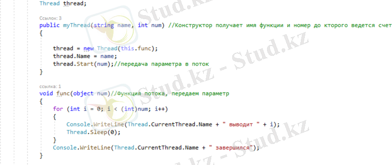 Бұл мысалды талдаймыз. Біздің класс mythread конструкторы 2 параметрді қабылдайды: біз ағын атауын анықтайтын жол және циклде есеп жүргізілетін нөмір. Конструкторда біз осы нысанның func функциясымен байланысты ағын жасаймыз. Бұдан әрі біз жасалған ағынның Name өрісін пайдалана отырып, біздің ағынға атау береміз. Және Start аргументті беру арқылы біздің ағын іске қосыңыз.