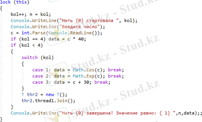 Бағдарламада кезекті тізбекті қосудың рекурсивтік тәсілі пайдаланылған - іске қосылатын тізбектердің санын шектеу if шартының көмегімен жүргізіледі (kol < 4) . kol айнымалысы 0-ден бастап өзгереді. Әр қосылған тізбекте өзінің T объектісі құрылады thr2 = new T() .