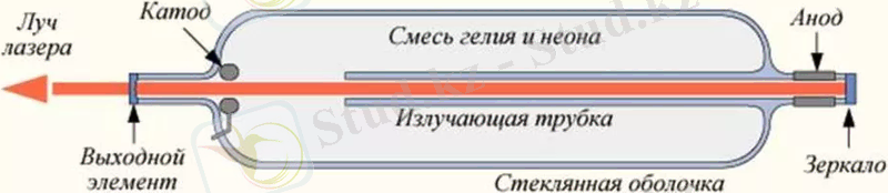 Газ лазерлерінің белсенді ортасы төмен қысымды газдар (жүзден бірнеше миллиметрге дейін сынап) немесе шыны түтікті дәнекерленген электродтармен толтыратын олардың қоспалары. Гелий мен неонның қоспасына негізделген алғашқы газ лазері 1960 жылы ластану лазерінен кейін А. Джаван, В. Беннетт және Д. Херриот (АҚШ) жасаған (сурет-2) . Газ лазерлері жоғары жиілікті генератормен қоректенетін электр разрядымен сорылады. Газ лазерлері, әдетте, үздіксіз сәуле шығарады. Газдардың тығыздығы өте аз болғандықтан, активті орта бар түтіктің ұзындығы жеткілікті үлкен болуы керек, сондықтан белсенді зат массасы жоғары радиациялық қарқындылықты алу үшін жеткілікті болады. Газ лазерлеріне сонымен қатар газды-динамикалық, химиялық және эксимерлі лазерлер кіреді (тек қозған күйде болатын молекулалардың электронды ауысуларында жұмыс жасайтын лазерлер) .