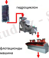 Гидроциклон - шламдарды және флотация өнімдерін қоюландыруға, айналмалы суларды ағартуға, шарлы диірмендермен бірге тұйық циклде ұсақ ұсақтау сатыларында кен қойыртпағын жіктеуге және пульпаның айналу нәтижесінде пайда болатын сулы ортада және ауыр суспензияларда кендердің жұқа фракцияларын байытуға арналған аппарат. Гидроциклондардың әрекет ету принципі сұйықтықтың айналмалы ағынында қатты фаза бөлшектерінің сепарациясына негізделген. Гидроциклонның ортадан тепкіш алаңында бөлшектерді сепарациялау жылдамдығының шамасы гравитация өрісінде эквивалентті бөлшектердің тұндыру жылдамдығынан жүздеген есе асып кетуі мүмкін. Соңғы уақытта байыту технологиясында гидроциклондар кластері жиі қолданылады, бұл классификация жұқа сақталған кезде ағын бойынша өнімділікті айтарлықтай арттыруға, сондай-ақ кластер қоректендірудегі қойыртпақтың қысымын төмендетуге және тиісінше қоректендіретін қойыртпақты сорғылардың тұтынылатын қуатын азайтуға мүмкіндік береді.