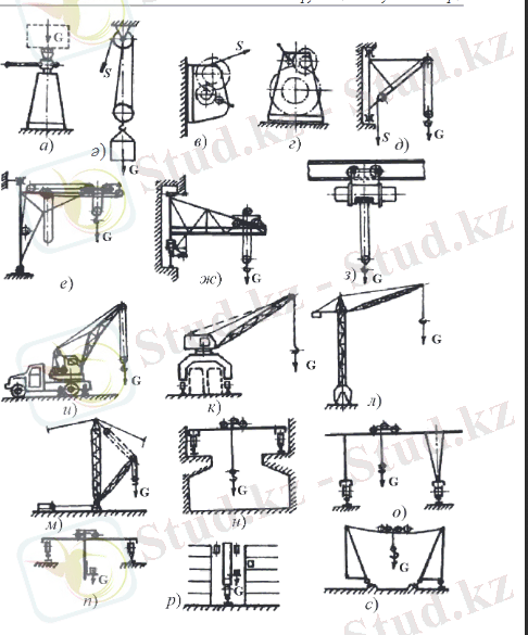 2. 2-сурет. Жүккөтергіш машиналар мен құрылғылар сызбасы:а - бұрандалы домкраттар; ə - полиспаст; в, г - қабырғаға ілінетін жəне еденге бекітілетін қол лебёдкалары; д - қабырғаға бекітілген кран; е, ж - стационарлық консольді қозғалмалы крандар; з - электрлі таль; и - автокран; к, л, м - порталдық, мұнаралық жəне ванттық-жебелі крандар; н, о - көпірлі жəне төрт тіректі тағанды крандар; п, р - көпірлі жəне стеллаждық кран-штабелёрлер; с - кабельдік кран .