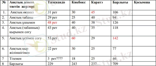 Кесте - 2 бойынша төмендегідей қорытынды шығарамыз. Шығыс жекпе жектерінде аяқтың денеге тиетін жерлерін анықтау өте маңызды орын алады, себебі техникалық әдіс айланы үйрету кезінде аяқтың денеге тиетін жерлері арқылы соққы түрі, оның күші, жылдамдығы, спортшының өз тепе теңдігін сақтау мүмкіндігі анықталады. Мысалы кестеде көрсетілгендей каратэ спортында аяқтың үстіңгі жағымен тебу ең көп қолданылса, таэквандода аяқтың ұшымен тебу, ал кикбокста айланып барып аяқтың өкшесімен соғу көп қолданылған. Барлық үш спорттүрлеріндегі қосынды бойынша ең көбі аяқтың үстімен тебу (142рет) екендігін көреміз. Сондықтан аяқтың үстіңгі жағымен соғу өзінің басқа түрлерге қарағанда неғұрлым қолайлы екендігімен, тебу кезінде спортшының өз тепе -теңдігін сақтап қалуына мүмкіндігі көп болатындығымен ерекшеленеді себебі аяқтың үстімен соғу кезінде спортшыға айлану, еңкею, бұрылу сияқты күрделі қозғалыстарды орындау жеңіл болады.