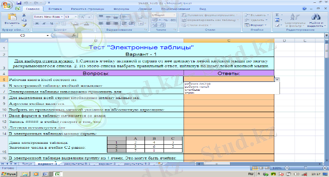 Microsoft Excelдерге көп әр түрлi Цорлар құруға болады. Бұл бағдарламалар нәтиженi санайтын және белгiлерге тап қалған мұғалiмнiң бағаға бере алған мұғалiм үшiн ыңғайлы. Мен өз классификацияларында Microsoft Excelдiң тақырыбы бойынша информатика бойынша тесттiң мысалдарын келтiрдiм. Жауаптың бiр варианты төрт таңдауы керек. Нәтиже батырмаға тесттiң орындауларынан кейiн басуы керек. Компьютер iстелiнген тапсырмалардың пайызы және бағаны процентадан сүйене көрсетедi. Тест оқушылар да орындаудың жанында, күштер мұғалiм де тексерудiң жанында көп керек болмайды, бiрақ бұл тесттердi құрасын нелiктен Microsoft Wordке, бұл бағдарламаның өйткенi негiздi бiлiмдерi тесттердiң құрастыруы үшiн жетпейтiнiн күрделiрек.